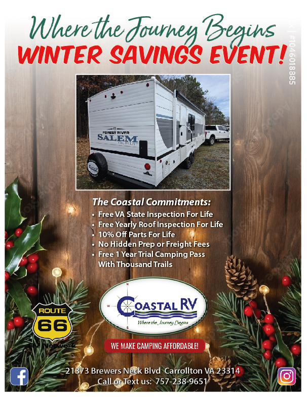 Contact UsCoastal RV is a full service RV dealership located in Carrollton, Virginia (in close proximity to Hampton, Newport News, Suffolk, Chesapeake, Norfolk, Portsmouth and Richmond). We offer the largest selection of Forest River trailers in the area. Including No Boundaries, R Pod, Un-Mapped, Salem, Salem Cruise Lite, Salem FSX, Salem Hemisphere, Salem Grand Villa, Salem Villa, Sandpiper, Solaire and Wolfpack. Our RV inventory consists of new and used Fifth Wheels, Toy Haulers, and Travel Trailers.